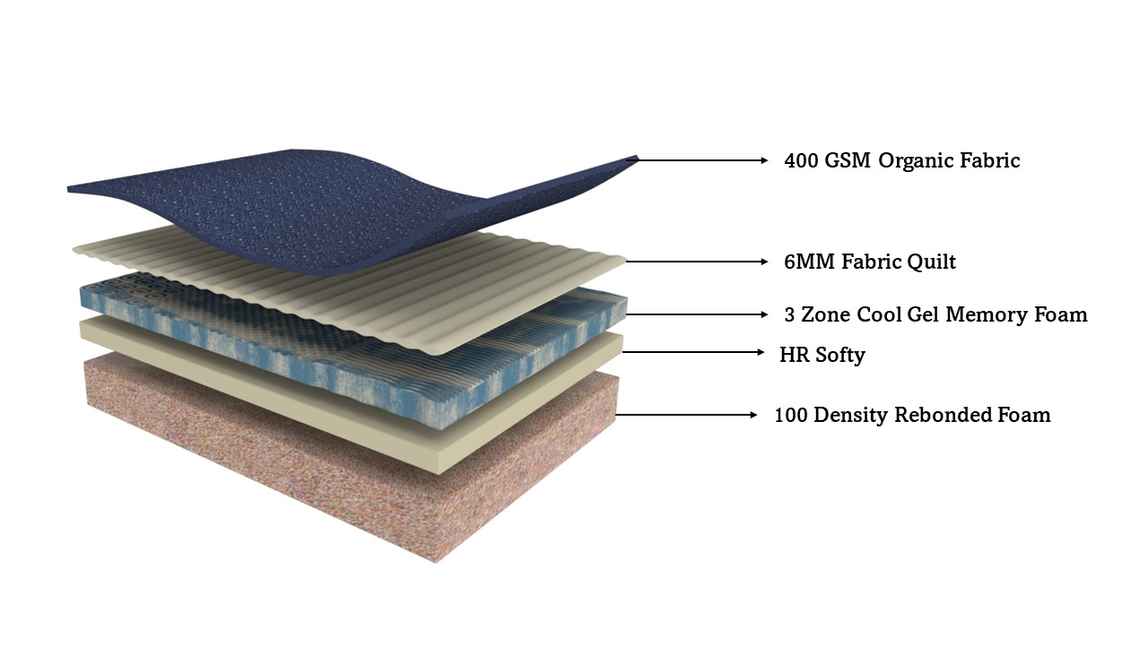 - Materials used : 100 Density Rebonded Foam + HR Softy Foam + 3 Zone Cool Gel Memory Foam