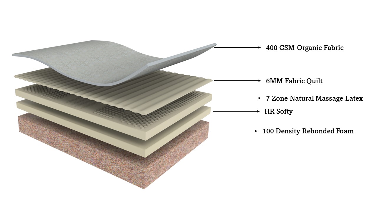 - Materials used : 100 Density Rebonded foam + HR Softy + 7 Zone Massage Latex